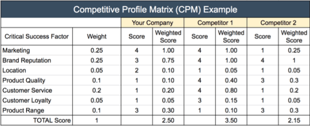 Using a competitive profile matrix (CPM), you can identify a firm’s and its competitors’ strengths and weaknesses using a competitive profile matrix (CPM). A CPM also allows firms to understand their external environment and competition better.