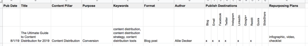 It’s necessary to have a content calendar as a part of the overall content marketing strategy. Having one will ensure that you always have an up-to-date list of every content piece you’re going to publish, the exact date and time of when you’ll publish it, and the distribution channels needed to publish it.