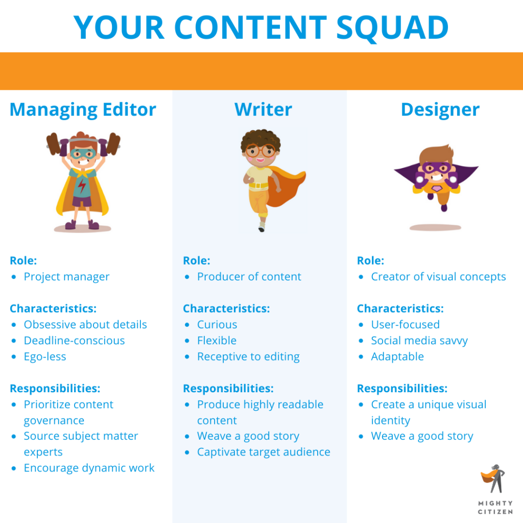 It’s imperative to have a leader for a team that includes editors, designers, and writers as members. This person is usually your managing editor or content strategist and is responsible for keeping the team’s activities consistent with the company’s growth goals.