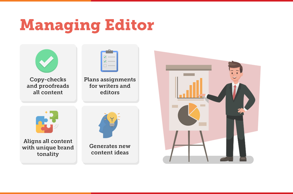 An organization’s actual storyteller is its managing editor. And it’s the managing editor who makes content compelling. Your editor is also the cornerstone of your content marketing campaigns. So, it’s important to make sure you choose one carefully. Look for someone who is organized, pays meticulous attention to details, and can meet deadlines. Also, editing and large egos don’t mix well. Your editor should be able to look at every situation objectively without bias or being unnecessarily critical. Since they are the backbone of your company’s content marketing team, their sense of responsibility matters greatly.