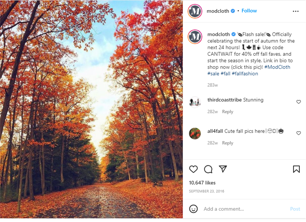 Modcloth is one brand that does a great job using landscape and scenery pictures to inspire its audience and create an interactive feed.
