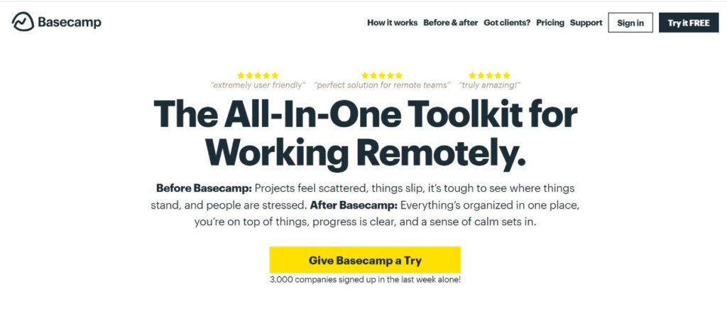 A good content writing example of straightforward call-to-action without discounting the taxing situation is Basecamp, a project management tool. It identifies the cause of its target audience’s problem and convinces them of its product’s value as its solution in just five sentences.