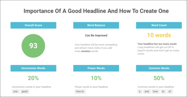 Another great content writing tool for headlines is Coschedule. Along with the headline score, it will also display the words of your headline that are influencing the score.