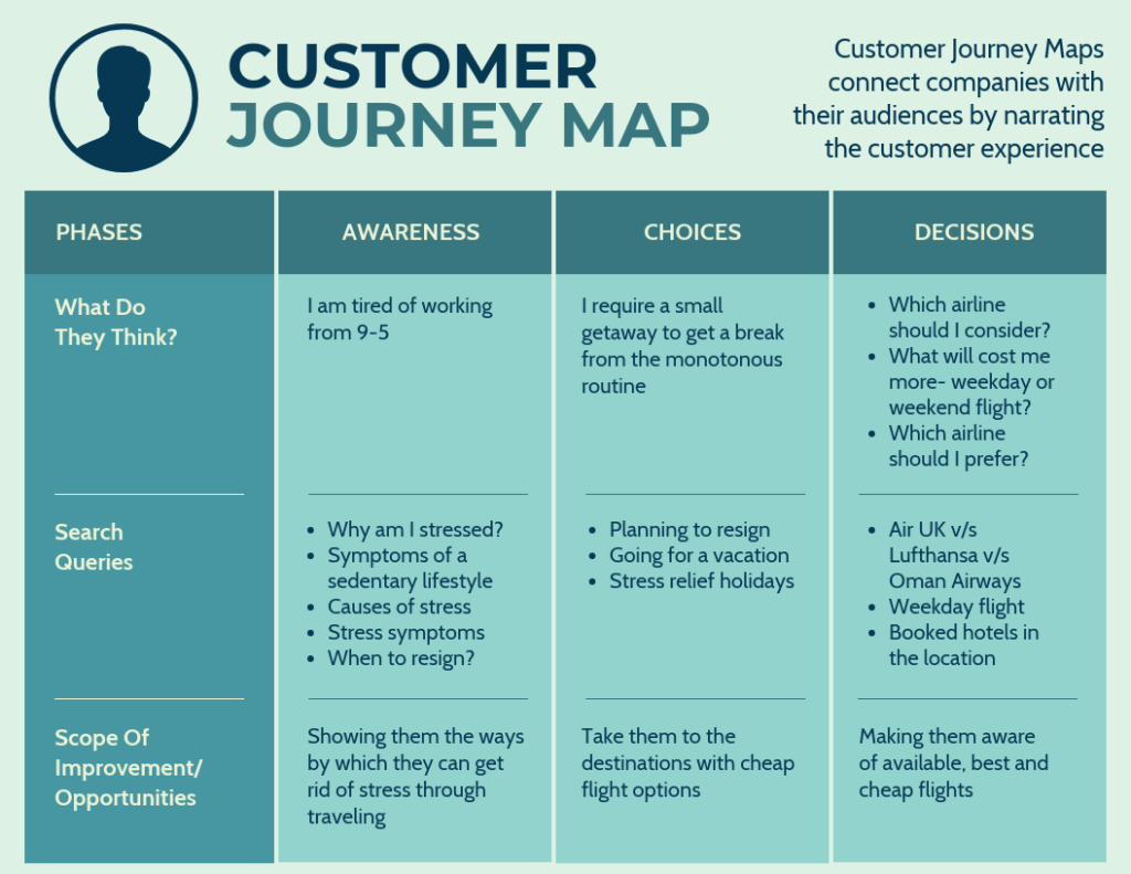A customer journey map provides a visual representation of the potential customers’ requirements and queries that motivate them to take action.