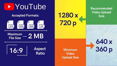 YouTube recommends using images smaller than 2 MB sized 1280 x 720 pixels (the width can go as low as 640 pixels). Make sure your image has a 16:9 aspect ratio and no text at the bottom-right corner since that is where the time stamp will appear.