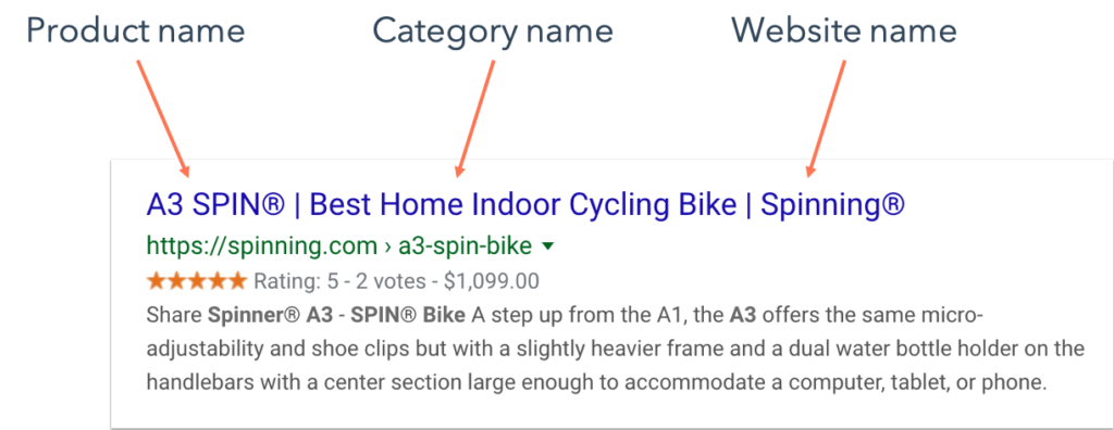Keep it brief because search engines only scan the first 50-60 characters. Although you have some leeway here, consider incorporating a product name, category name, and website name in your page’s title tag.