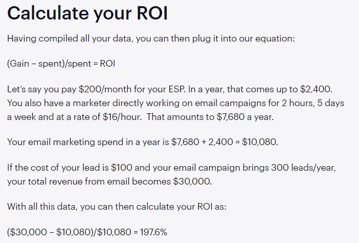This helps ascertain the profitability of the email campaign you run. Though it can be a challenge to have the exact numbers as there are many variables involved, it nevertheless can give you an idea of whether the campaign was a success or failure. It is calculated as follows: