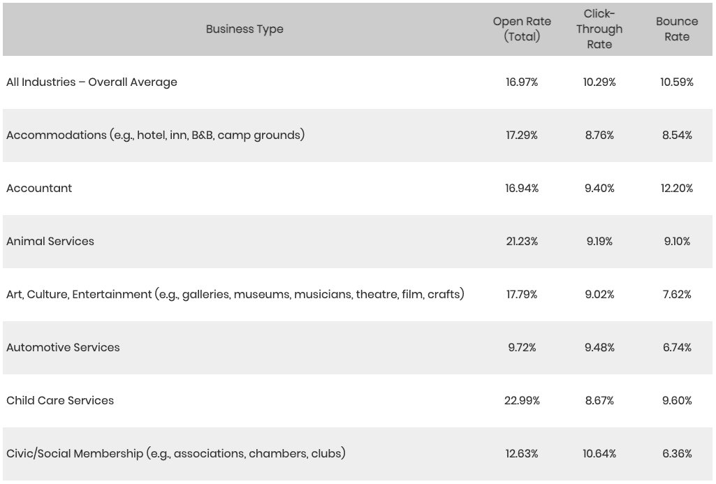 The average click-through rate for email marketing is 2.5% according to Campaign Monitor, but the higher, the better. If your click rates are low, you may need to revisit your email content and also your audience list.