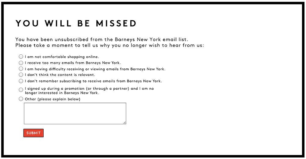 This is an important email marketing KPI. Every email marketing engine automatically attaches an ‘unsubscribe’ option to every email sent out to subscribers. This exit strategy will give you an inkling about why subscribers prefer to opt-out of receiving your emails. This is done by asking them to fill out a survey that includes questions about why they would prefer to stop receiving your emails. The ‘unsubscribe’ metric comes in handy to fine-tune your subscriber list.
