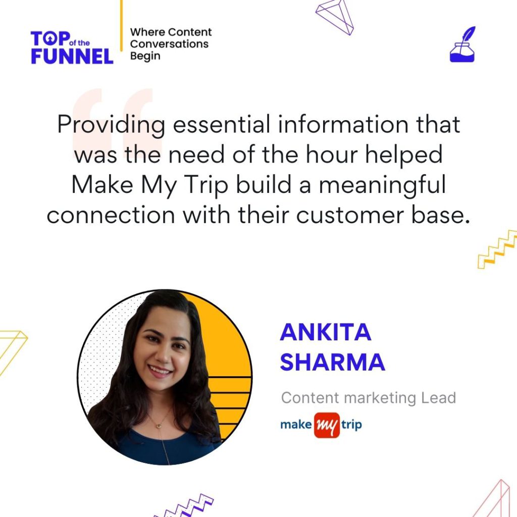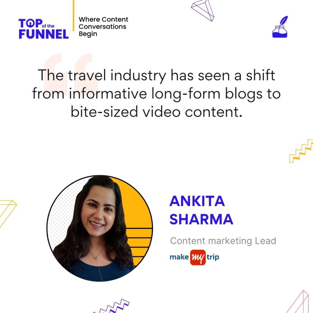 Natasha Puri: Hello everyone. Welcome to Top of the Funnel, the series where conversations about content begin. Our guest today is Ankita Sharma, Content Marketing Lead, at Make my Trip. This chat promises to be very informative and insightful. Ankita Sharma is at the helm of all things content in Make my Trip. She will take us through the evolution of travel content from the pre-pandemic to the post-pandemic times.