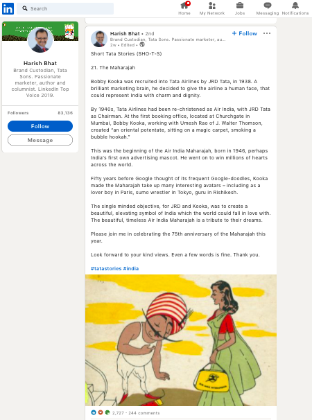 Let’s consider a lot of the content created by internal leaders at Tata Group of Industries for a minute. One of the web pages of the Tata website is titled “Tata Stories of Heritage.” All thought leadership content around the brand and its leaders is extremely anecdotal,i.e., driven by stories of Ratan Tata and his response to various situations. This is the case because stories help build a legacy that Tata has established over decades of existence in India.