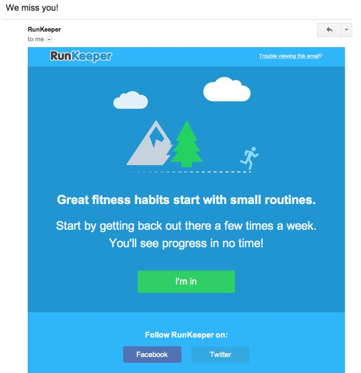 With this polite, informative email, RunKeeper tries to re-engage users who have stopped using their services. The content focuses on convincing recipients to give their app one more chance by highlighting its latest upgrades and features. It also informs its audience about the perks that they may not have been aware of when they last accessed the software. It succeeds because minor details make the material feel more friendly and organic.
