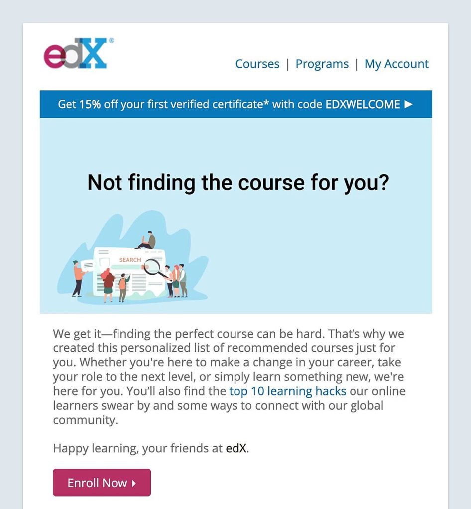 edX is following the same path and has sent this email. There is a strong and clear message in this email, giving it the appearance of a mini-website landing page. It’s topped off with a solution, i.e., a personalized list of recommended courses, along with a clear CTA. It also gives users an incentive (a discounted verified certification) to take action. If you’re in the education field or have an academy page, be sure to adopt a similar email campaign idea.