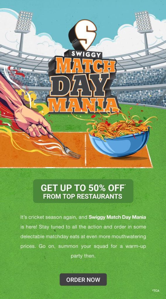 Everyone is looking forward to hearing the fantastic news! And if this occurs during the Cricket World Cup, the pleasure of purchasing your favorite foods from Swiggy is amplified. A named email campaign is successful in capturing readers’ attention. “Match Day Mania” appears to be the most cost-effective option.