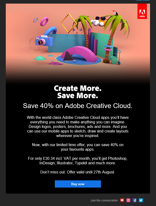 This email marketing screams exclusivity from every angle. With a powerful tagline, exciting offer, and clear CTA, this email campaign example is surely a winning one. Do notice the limited-period offer on the Adobe Creative Cloud apps. Adobe has surely devised one of the best email marketing campaigns.