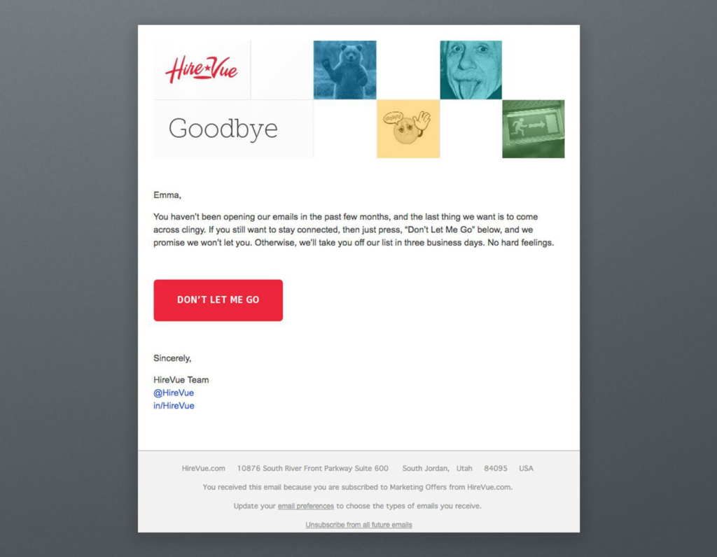 The topic of HireVue’s automatic unsubscribe email was how it is never easy to say goodbye. From the humorous header pictures to the wonderful CTA button language, we appreciate the uncomplicated messaging here.