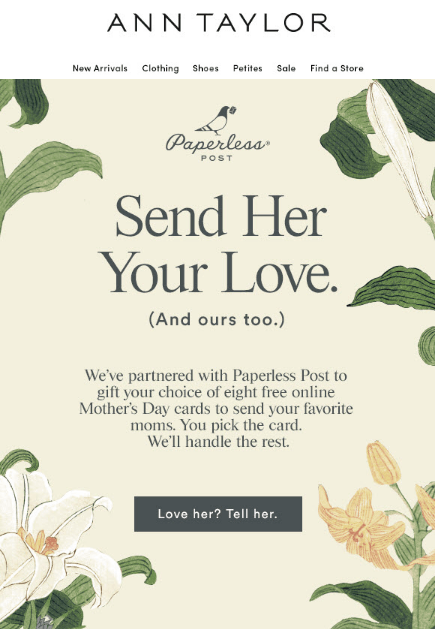 Take, for example, this email from Paperless Post, which is centered on Mother’s Day. It has a clear CTA that builds a sense of urgency. The subheader then poses a query that prompts recipients to ponder, “When is Mother’s Day this year? Is it true that I forgot to buy mom a card?”