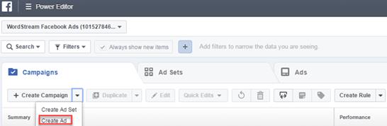 Go to the Facebook Power Editor and select the option to “create a campaign on the left side.” Under this option, select “create ad.”