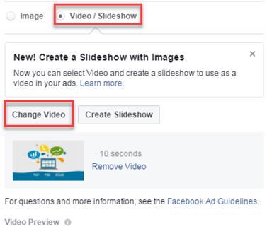 Now, with the help of the radio button in the ad editing menu, select “video/slideshow.” Instead of “change video,” there will be an “add” button. Click on the “add” button to upload the GIF you created with GIPHY.