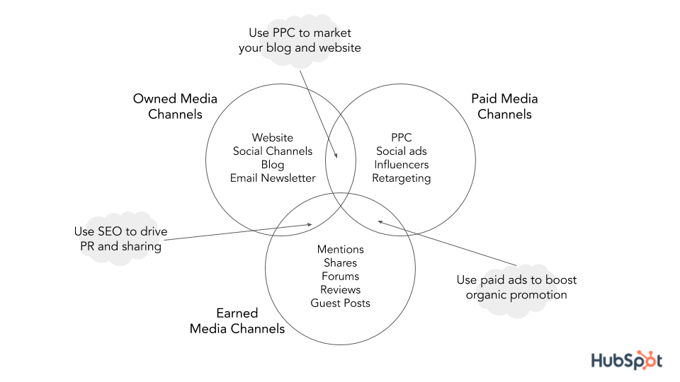 This diagram by Hubspot shows how you can combine these channels for the maximum benefit.
