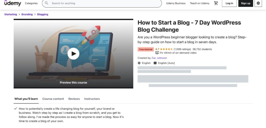 This detailed course on Udemy teaches you to set up WordPress, create your blog on the platform, start mailing lists, and much more. This is a great free blogging course for beginners who need help setting up their website and have minimal coding or website development knowledge. You can get started with this highly reviewed course here.