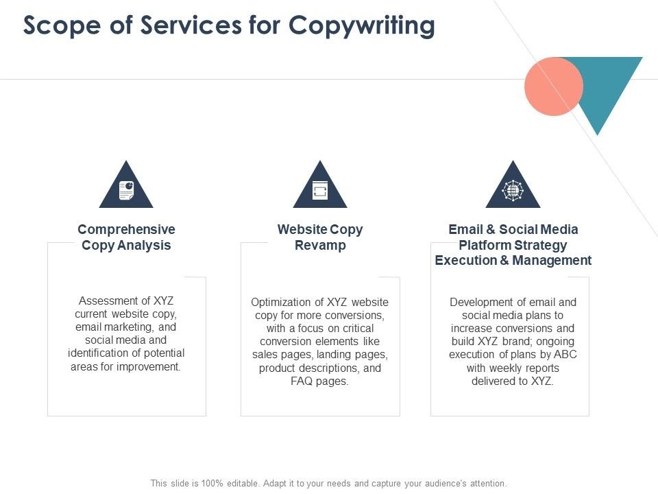 - Research: Many companies and clients are looking for good freelancers. Before you take up any copywriting gig, know about the company, the products, or the services it provides. Understanding the client will help you write content aligned with the brand’s voice.