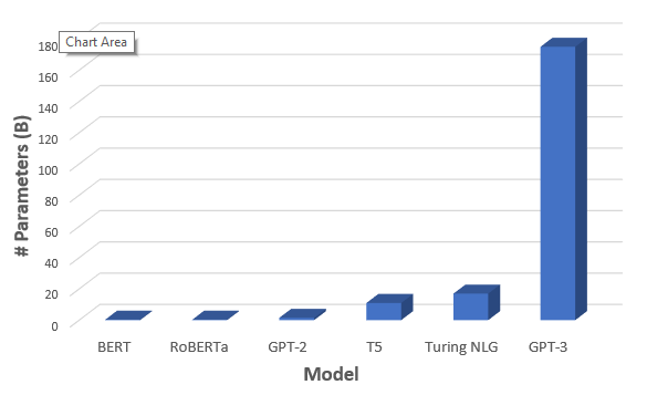 Different language models exist, such as BERT (Bidirectional Encoder Representations from Transformers), RoBERTa (Robustly Optimized BERT Pre-training Approach), GPT-2 (Generative Pre-trained Transformer-2), T5 (Transporter 5), Turing NLG (Natural Language Generation), and GPT-3. Out of all, GPT-3 content generator is the most prominent language model having 175 billion characters. No competitive language model is near this GPT-3 scale; the nearest is Microsoft’s Turing NLG which is ten times smaller than GPT-3. It is 100 times larger than GPT-2, GPT-3’s previous version, as shown in the image below.
