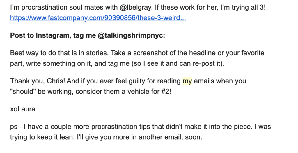 If someone has mastered the art of email writing, it’s Talking Shrimp’s Laura Belgrade. Talking Shrimp undoubtedly has the best email conversion rates and that’s for a specific reason. Like your best friend would sit and have a conversation with you, Talking Shrimp’s emails grab your attention and affection with their honest, genuine, fun, irreverent tone. There is a humor and there is intimacy as well. The subject line is so designed that it shakes your curiosity and you feel as if the person writing the email knows you better than your next-door neighbor.
