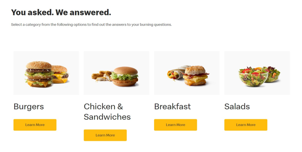 If you are on the lookout for inspiring and great copywriting examples for a brilliant FAQ page, McDonald’s is the right website to checkout, for more than just what’s on the menu! McDonald’s has a really detailed FAQ page, with a search for a question bar. They have outlined your innermost queries about your burgers and more, in the form of hypothetical questions with detailed answers to each. Not only does their FAQ explain what’s on their menu, what ingredients go into making that delicacy but also, how your regular coffee is different from espresso and why they don’t call their shakes, milkshakes. These questions are not just engaging and fun, but they also address the customers’ concerns. Smartly enough, McDonald’s includes keywords and keyphrases into the content of these questions.