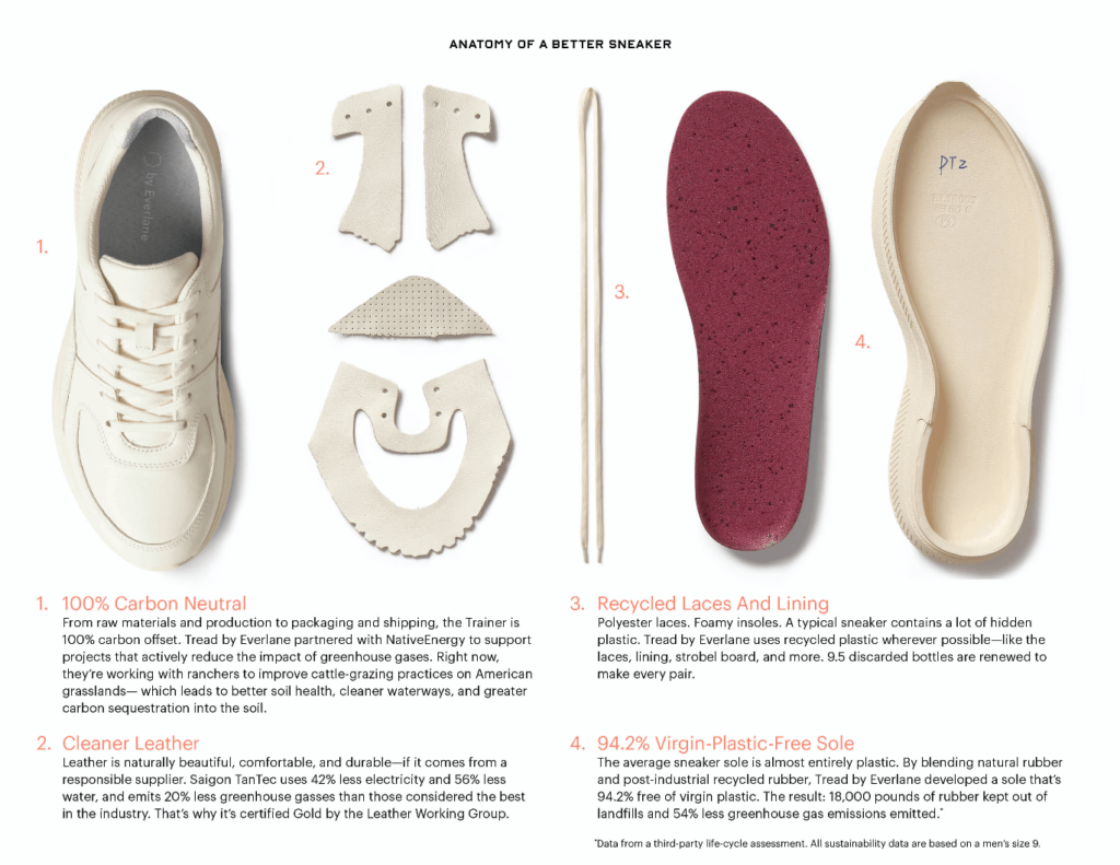 One of the best creative copywriting examples is the product category page for sneakers on Everlane’s website. Everlane is a sustainable clothing and accessories brand. Their USP is transparency and accountability. They amplify this trust factor by clearly outlining on their product page, how every element of their sneakers is produced- ranging from the sole, laces, linings to the leather. Their product category pages display a detailed explanation of the steps involved in manufacturing a ‘low-environment impact’ Everlane sneaker.