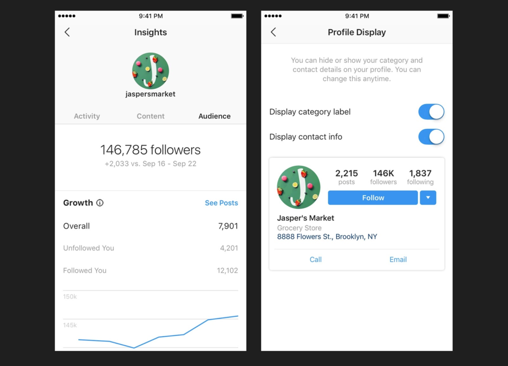You can get access to built-in insights about your account reach, impressions, and interactions on a particular post or a story. These metrics allow you to analyze your account’s success and performance, and optimize or tweak your marketing strategy accordingly.