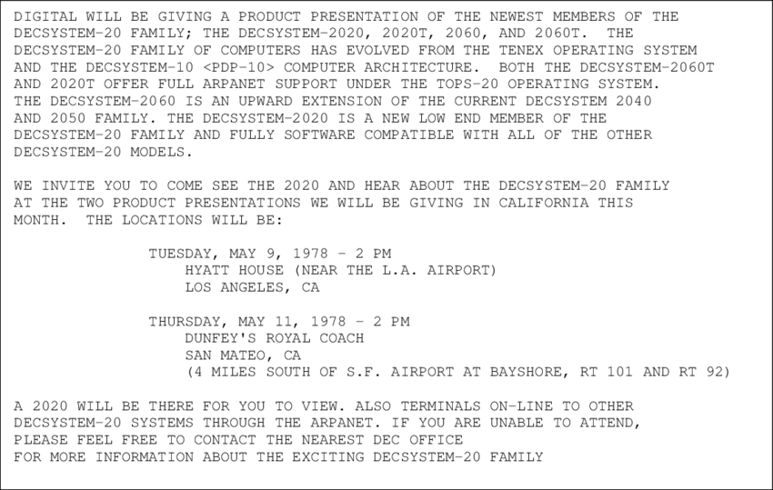 The first email in the history of the internet was sent on May 3, 1978. Gary Thuerk, a marketer at Digital Equipment Corp, sent a bulk commercial email to 393, customers notifying them about a new computer model that was available. Here’s what the email looked like.