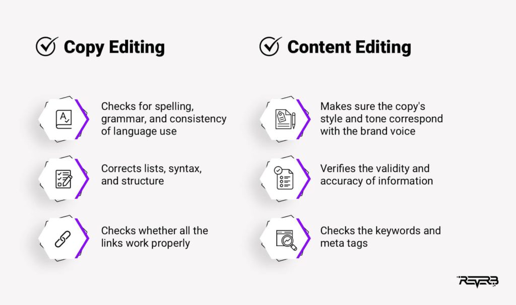 Let’s now understand the difference between content editing and copy editing. Simply put, content editing is responsible for making writing effective, connected, and understandable, meaning to check the strength and logic behind the argument, the sources and examples’ quality, its match with the brand voice, and the scope of the text.