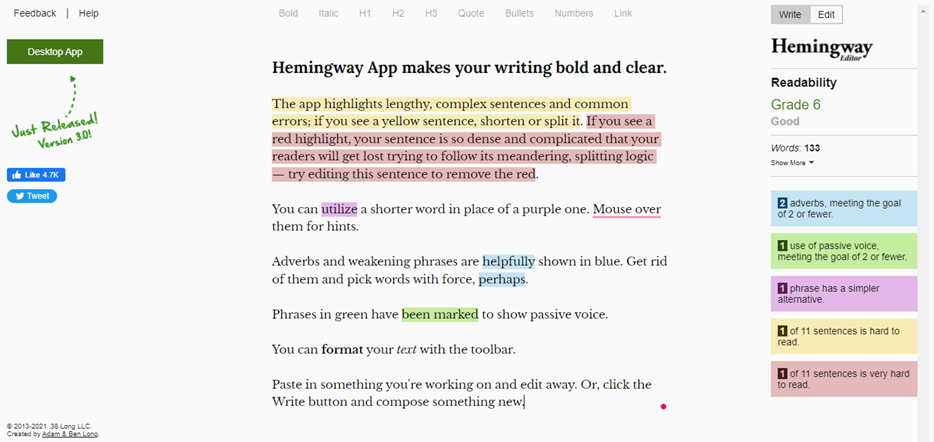 The Hemingway app is a writing and editing tool that helps polish one’s writing. It concentrates on pointing out common errors that reduce your content’s quality like inappropriate sentence construction, too many weak adverbs, excessive use of passive voice, etc.