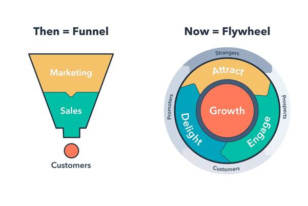 This modified sales funnel is known as the ‘sales flywheel’. It looks like the following: