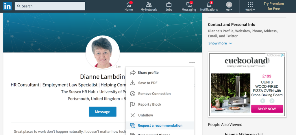 And, getting recommendations on LinkedIn from your past and existing clients is the best way to show your expertise. All you need to do is to visit the concerned person’s LinkedIn profile and request a recommendation, as shown in the picture below.