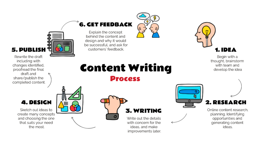 The next step is the act of producing actual content. Written content supported by videos, images, and other graphics is what content writing is all about today.
