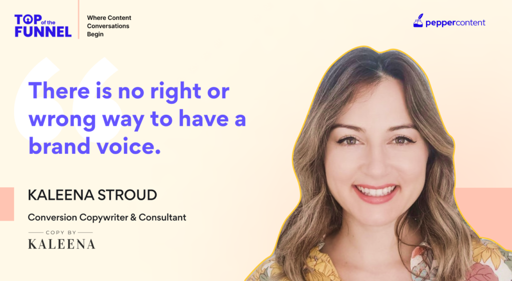 In this episode of Pepper Content’s Top of the Funnel, Natasha Puri, Content Marketing Lead at Pepper, dives into a conversation around brand voice and writing with Kaleena Stroud, freelance conversion and copywriting consultant at Copy by Kaleena.