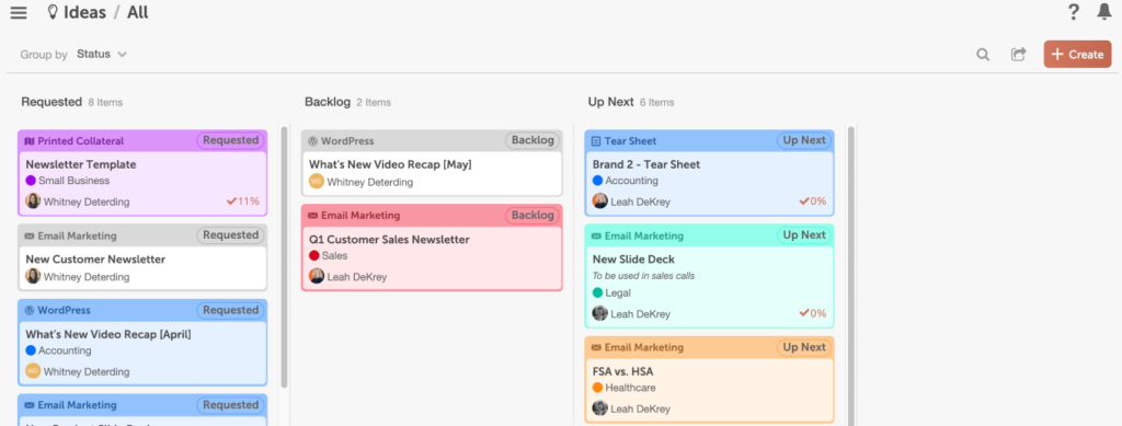 Trello helps you add cards under each list and assign individual cards to members within your organization whose profile picture can be seen under it. You can also make updates within the activity section of the cards to show progress. The best part about Trello’s workspaces is the ability to keep backgrounds. Imagine a picture of a kitten in your social media calendar — it can help keep your tension levels in check.