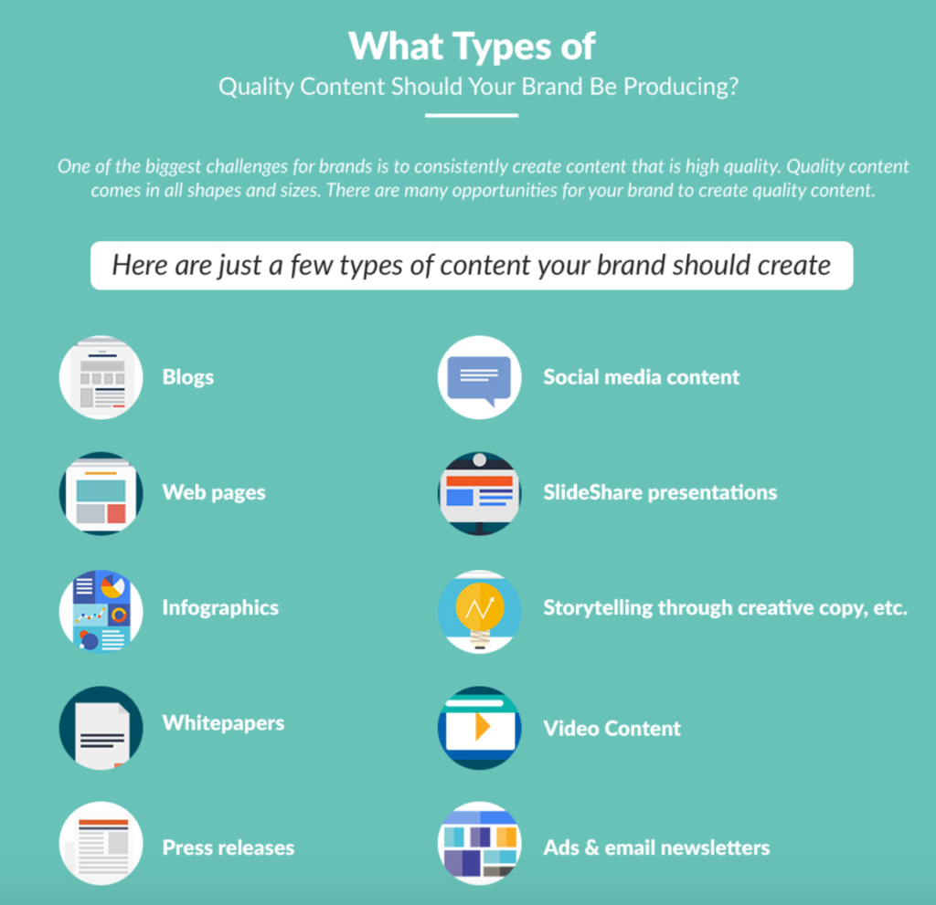 Content writing revolves around different types of text-based content. Each type of content has a different set of goals and purposes that help promote the brand differently.