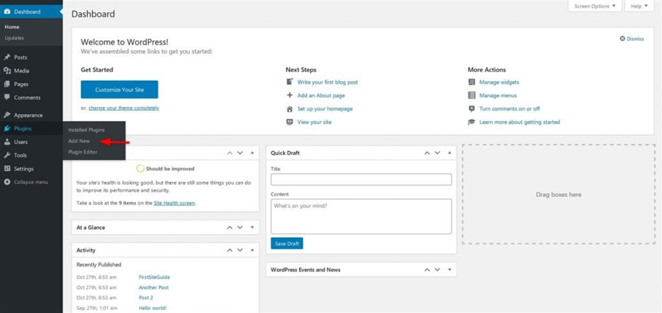 - Choose Plugins>Add New from the dashboard.