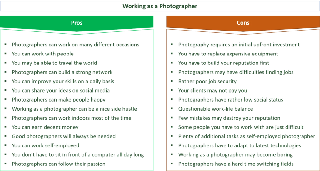 As mentioned above, freelance photography is a different arena than a conventional job in photography. That is because a freelance photographer must assume the obligations and responsibilities that an employer would typically accomplish, like, legal issues, taxes, marketing, and scheduling.