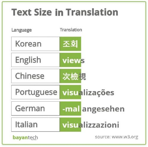 Text expansion rates may vary, and when you translate from English to languages like Spanish, Italian, or French, there could be up to 25% expansion. When a language like German is the target language, the expansion rate may go as high as 35%. Conversely, translating from English into Chinese, Korean, or Japanese is likely to contract, with a significant fluctuation in percentages.
