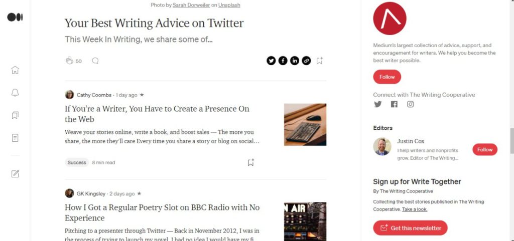A Medium publication is a shared space for authors to co-create and co-publish stories. While the selection criteria can be stringent, there are many benefits of being part of a Medium publication or creating one. Some of these include customizable layouts, the ability to work with multiple contributors, a homepage, and insights, among others. The Startup, UX Collective, and The Writing Cooperative are three of the many active, insightful Medium publications you can look up.