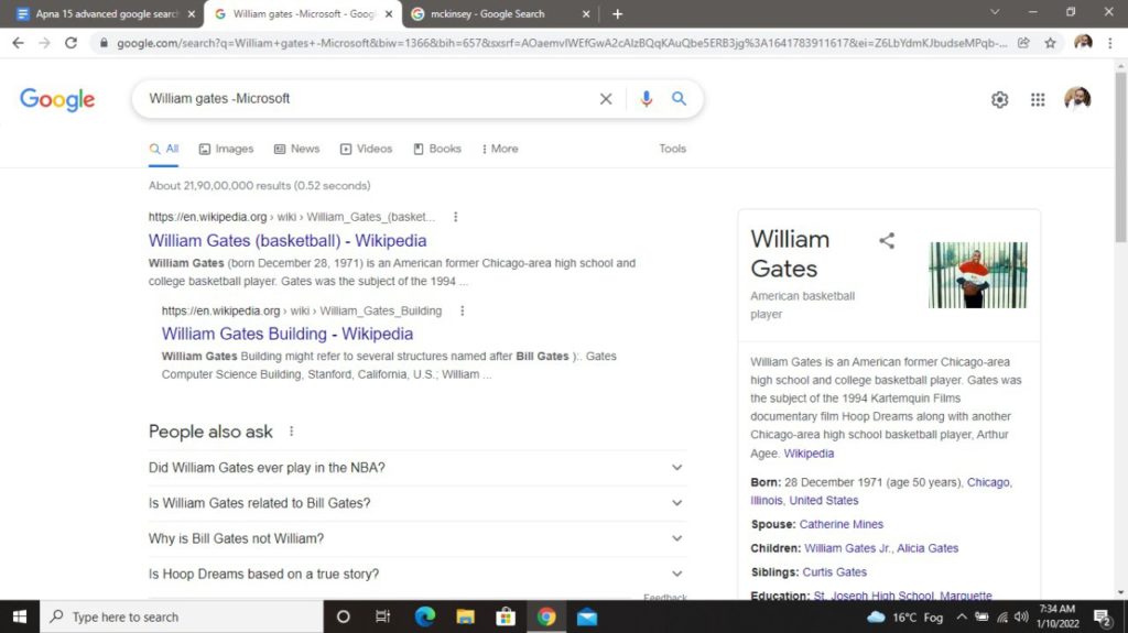 Similarly, the “-” command tells Google to search for something other than the term specified after the command. For instance, if you search William Gates -Microsoft, you would get information about William Gates, the basketball player, and not the father of Microsoft cofounder Bill Gates.