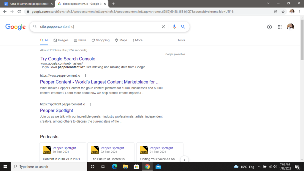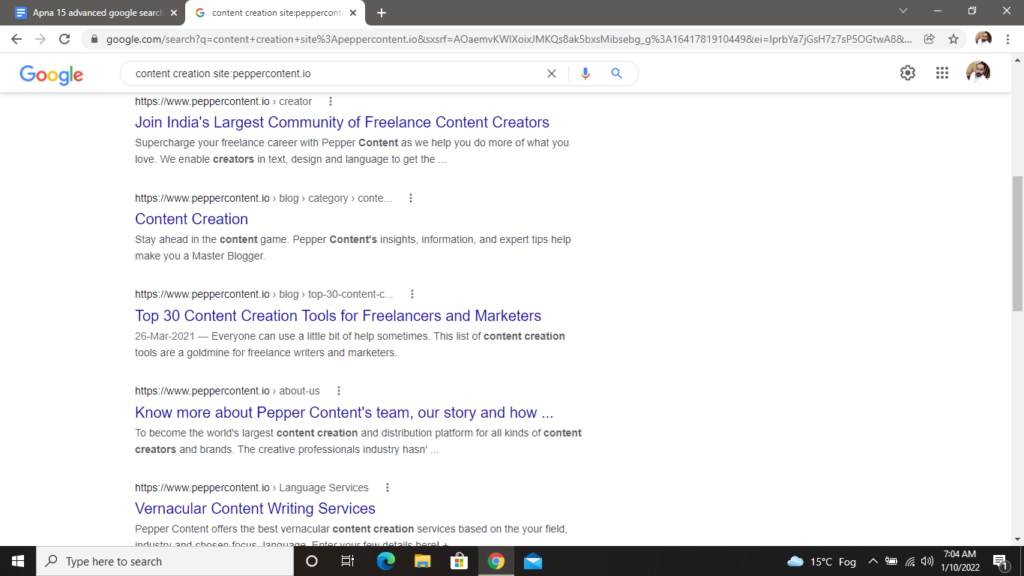 You can also narrow down the results to a specified topic within this domain. For example: “content creation site:peppercontent.io”.