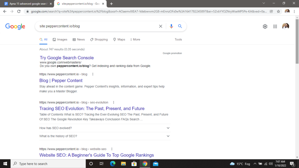 Another great use of this command is to determine which pages on your website are not indexed or whether any pages have been indexed numerous times, resulting in content duplication. This is important, because if your site has 1,500 pages but only 500 of them have been indexed by Google, you would know that something is wrong and needs to be addressed. When searching for indexed pages, you can further narrow down the search to specific categories. For instance, if you search “site.peppercontent.io/blog”, you will get all the blog posts on our site, indexed by Google.