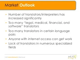 Machine translation is rising, resulting in a drop in prices and reduced interest in some niches. You will have difficulty finding new clients if you do not know the market well enough to make accurate predictions.