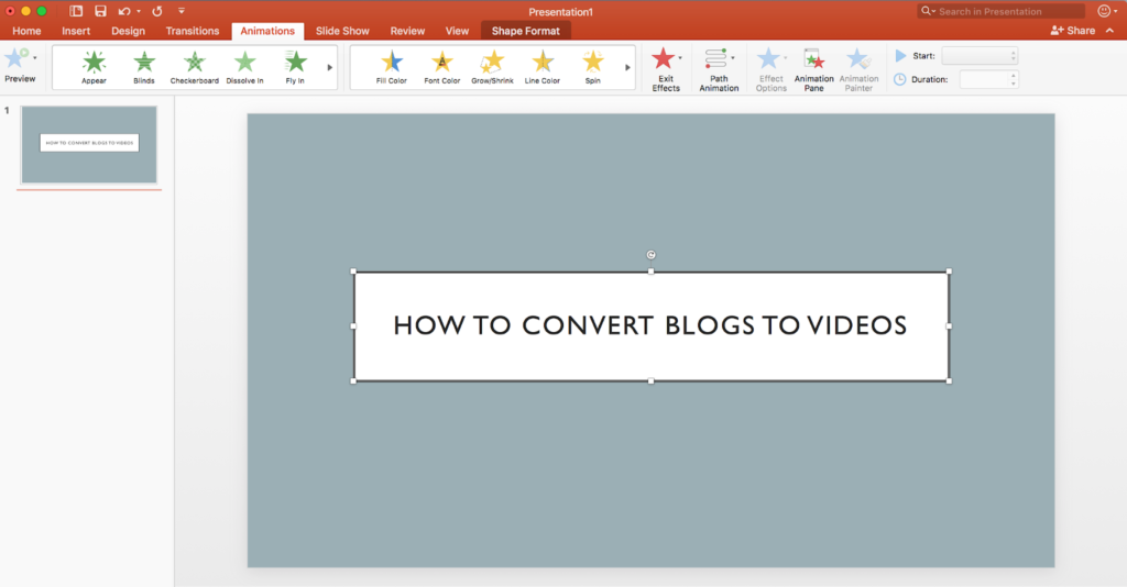 Microsoft PowerPoint gives you access to various animation and transition effects that you can use to build a video out of an existing blog. Apart from using stock footage or just a recording of yourself talking, you can also experiment with adding charts and infographics to your presentation.