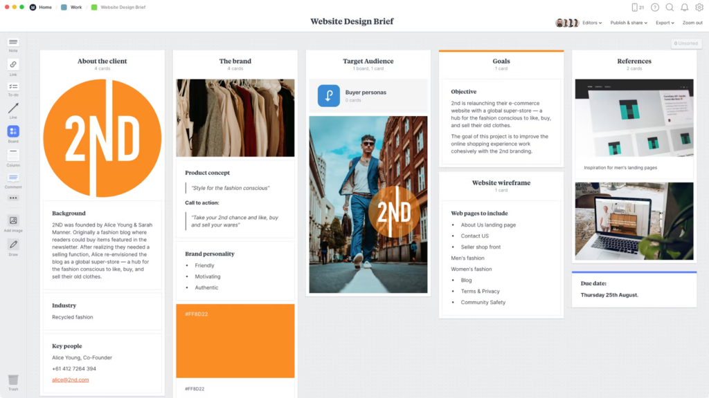 This is useful for the design team to get necessary information about the project. The profile section can include aspects such as the sectors the company does business in, types of products and services, and perception of the brand. It’s also important to mention specific challenges, and what the competition is doing.